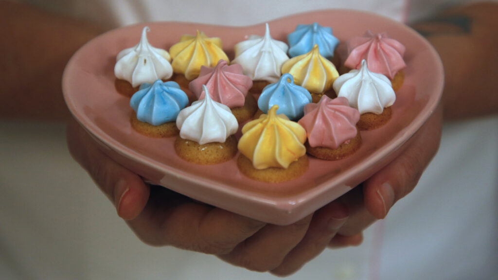 - Colorir o merengue com as cores escolhidas e colocar nos sacos de pasteleiro previamente preparados com a boquilha estrela.