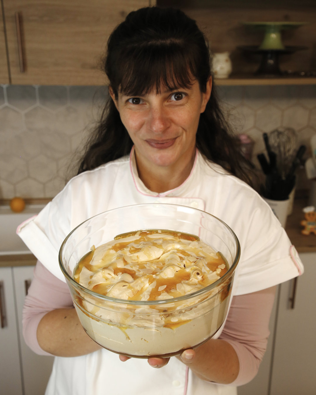 7. Retirar do forno, colocar caramelo liquido em fio e polvilhar com amêndoa laminada torrada.
